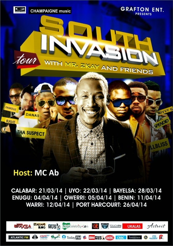 Grafton Entertainment-PTP in collaboration with Champagne Music proudly presents Nigerian south Invasion tour with Mr 2kay and friends. Port Harcourt based Act, the bubugaga crooner is set for a tour round the south of Nigeria visiting Calabar, Uyo, Yenegoa, Enugu, Owerri, Benin, Warri And Port Harcourt. Mr 2kay will be joined by his friends as special guest in the persons of Illbliss, Tha suspect, Nivvy G who have confirmed to be part of the tour. Meanwhile other south based acts in the Likes of Danas, Splendid, Romel, Rave, Famous, Mc AB, plus more are expected to join in the tour to support mr 2kay.