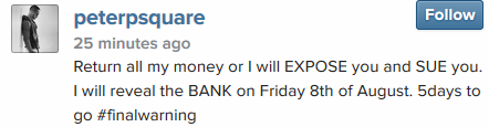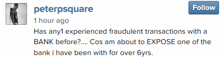 Peter Okoye threatens to expose a bank for fraudulent transactions Posted by 9jasouth on 08/03/2014 Posted in: GIST, PHOTO. Leave a comment 5 days to go…we dey wait! 🙂 Share this:bingShare on TumblrTweet Email a link to a friend (Opens in new window) Email Like Loading... Related Posts navigation ← according to Burna Boy… Rita Dominic Steps Out Looking Fab →