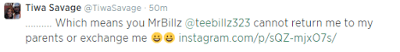Tiwa Savage tells Teebillz he can’t divorce or exchange her Posted by 9jasouth on 09/08/2014 Posted in: GIST. Leave a comment The caption has said it all…don’t you just love this Nigerian Beyonce and Jay Z?! Share this:bingShare on TumblrTweet Email a link to a friend (Opens in new window) Email Like Loading... Related Posts navigation ← Man And Wife Arrested in Abeokuta For Allegedly Fighting N**ude in Public Women Can’t Seperate Us Atall” – Bracket →