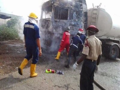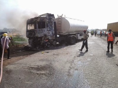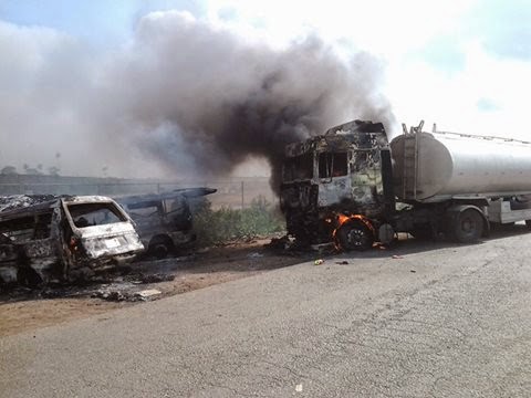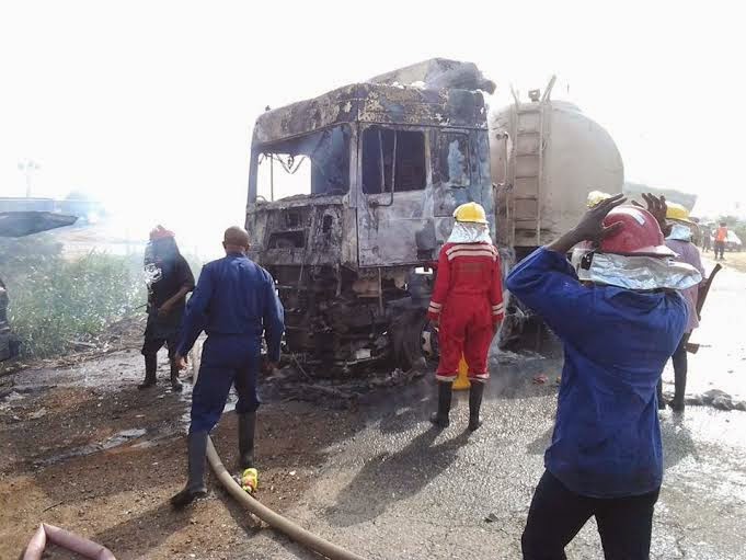 According to eyewitnesses, 2 Mazda cars collided with a Petrol tanker which immediately busted into flames. Men of the Nigeria Fire Service, Police and FRSC are currently at the scene managing the situation. The fire has since been put out but the traffic is still said to be on a standstill. Continue…