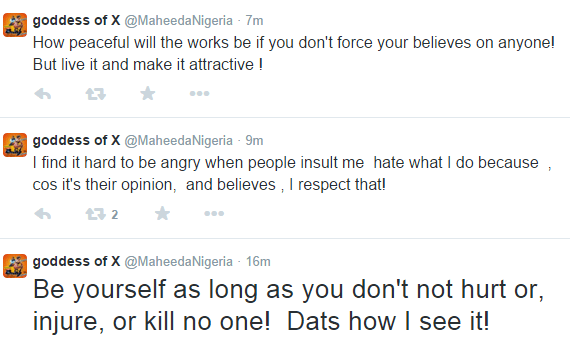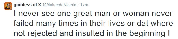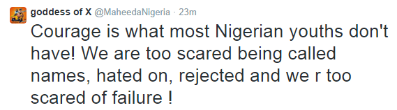 Maheeda talks about why many youths in Nigeria fail Posted by 9jasouth on 10/07/2014 Posted in: GIST. Leave a comment Singer Maheeda took to twitter to share her thoughts on why some youths fail. See more tweets after the cut… Share this:bingShare on TumblrTweet Email a link to a friend (Opens in new window) Email Like Loading... Related Posts navigation ← Drake wanted in Texas for allegedly threatening a Houston stripper See first pics of the transexual wife who was murdered & cooked by her husband →