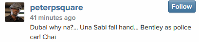 Peter Okoye talks about how his Bentley is used as police car in Dubai Posted by 9jasouth on 10/07/2014 Posted in: GIST, PHOTO. Leave a comment Share this:bingShare on TumblrTweet Email a link to a friend (Opens in new window) Email Like Loading... Related Posts navigation ← Photos: The moment Port Harcourt held her breath Frightful photo: Bird allegedy turns into woman at Oshodi →