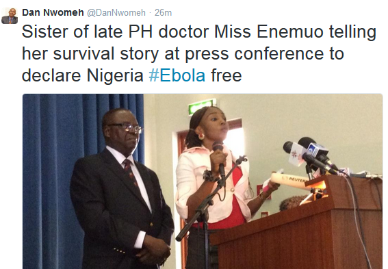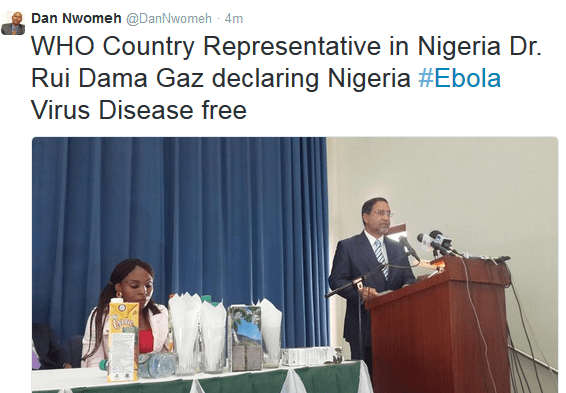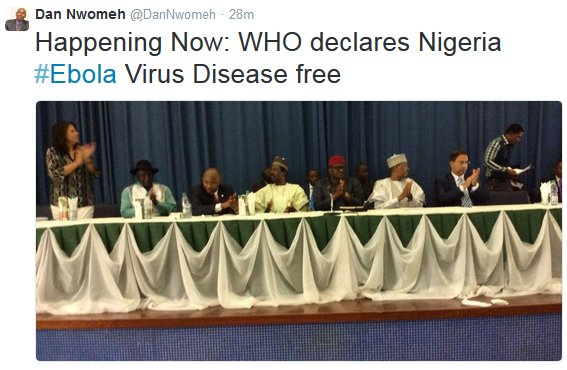 The World Health Organization, WHO, and the Federal Ministry of Health are currently holding a joint press conference in Abuja to formally declare Nigeria Ebola Virus Disease free. We thank God!