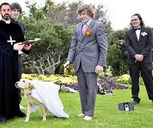 A self-described ‘religious guy,’ he said he could no longer stand the guilt of living with the canine cutie out of wedlock. But, ‘it’s not sexual,’ he assured the wedding guests.
