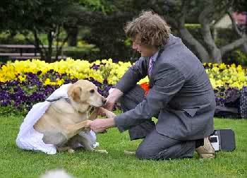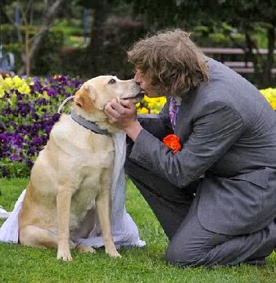 An Australian man staged a ‘marriage’ to his beloved yellow Labrador dog in an outdoor ceremony and promptly sealed the union with a kiss.