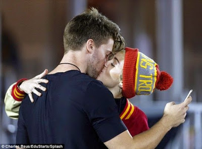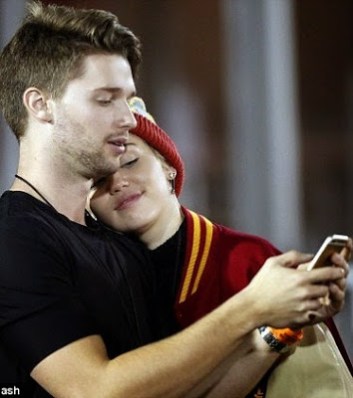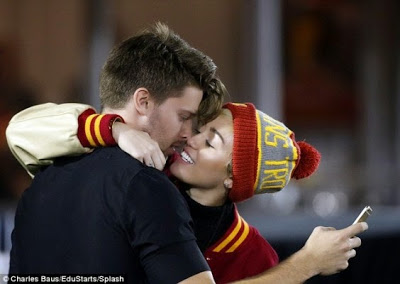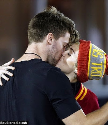 Patrick Schwarzenegger is the first son of action hero Arnold Schwarzenegger and Maria Shriver and he’s gorgeous. There were reports that Miley was dating Patrick after they were spotted out on several dates in LA but nothing was confirmed until yesterday when the two locked lips in full view of spectators during a football game yesterday at the LA Memorial Coliseum. Patrick is 21, Miley will soon turn 22 and she looks smitten. More pics after the cut…
