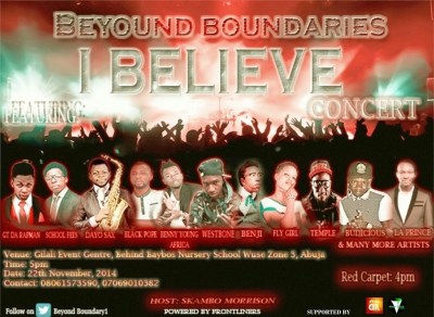 GATE FREE________________________________________________________________VENUE: GALALI EVENT CENTRE BEHIND BAYBOS NURSERY SCHOOK WUSE ZONE 3, ABUJA ________________________________________________________DATE 22 NOV. 2014 | RED CARPET 4PMCONTACT: 08061573590 OR 08069010382 ________________________________________________________________POWERED BY FRONT-LINERS. HOST SKAMBO MORRISONSUPPORTED BY AIT & ABUJAROCK