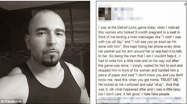 At the end of the game, Lye handed the man a note revealing the alleged adulterous text messages, and later posted pictures of the note and the couple to Facebook. The images have since gone viral and are now sparking a heated debate online about whether it’s appropriate to wade into a complete stranger’s relationship. According to Lye’s post on Facebook, he was attending a Detroit Lions game last month when he was