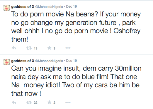 “Can you imagine insult, dem carry 30million naira dey ask me to do blue film! That one Na money idiot! Two of my cars ba him be that now ! To do p**n movie Na beans? If your money no go change my generation future, park well ohhh I no go do porn movie ! Oshofrey them!”