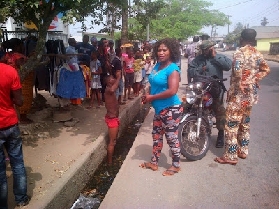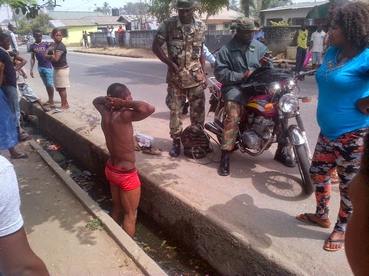 It happened this afternoon along Ikot Ansa Road in Calabar, this dude went to buy boxers and gave the seller N500, immediately the woman inserted the money in her wallet, all the money she had sold for the day disappeared. Shocked, she shouted ”Inor’! Inor’! (Thief! Thief). Unfortunate for the dude, soldiers were passing at the time.