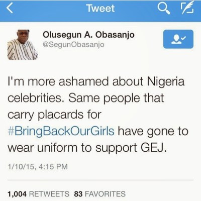 He twitted and condemned the actions of Nigerian celebrities for supporting Goodluck Ebele Jonathan…