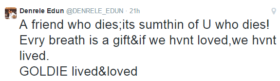 Heart Broken Denrele Visits Goldie’s Burial Place Posted by 9jasouth on 02/19/2015 Posted in: ENTERTAINMENT, GIST. Tagged: Heart Broken Denrele Visits Goldie’s Burial Place. Leave a comment We marked her 2nd year remembrance here yesterday. Denrele visited Goldie’s tomb yesterday too. So sad… Share this:bingShare on TumblrTweet Email a link to a friend (Opens in new window) Email Like Loading... Related Posts navigation ← German Juice : Cynthia Morgan Bares her Oranges on Instagram MUST READ!!! I INTENTIONALLY INFECT MY WIFE WITH HIV – HANKS ANUKU →